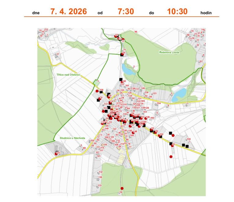 Plánovaná odstávka proběhne 7.4.2026 od 7,30 do 10,30 hodin : část obce Studnice č. p. 10-20, 33, 37, 39, 43, 53, 55, 56, 58, 59, 63, 71, 74, 75, 76, 80, 82, 85, 89, 112, 113, 135, 140, 142, 143, 148, 150